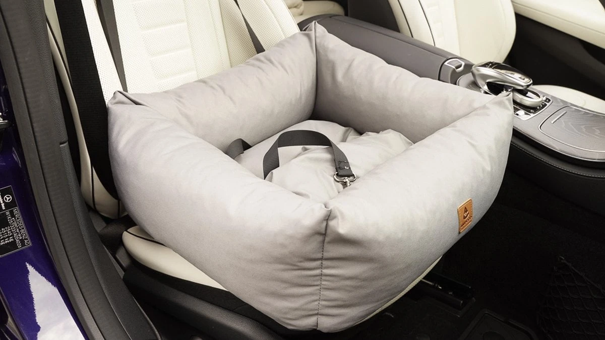 Het hondenzitje van de koder naar de auto ziet eruit als een klassiek hol. In tegenstelling tot hem is hij echter uitgerust met een riem met een klemregelaar die in de auto moet worden bevestigd en een verstelbare riem met een karabijnhaak.