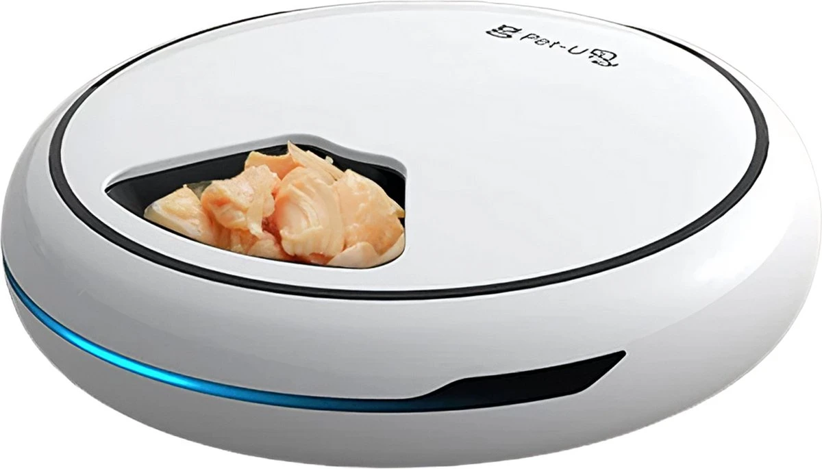 Een Witte Automatische voerbak voor de kat en hond met meerdere vakken waardoor u uw huisdier verschillende soorten maaltijden op afstand kan geven.