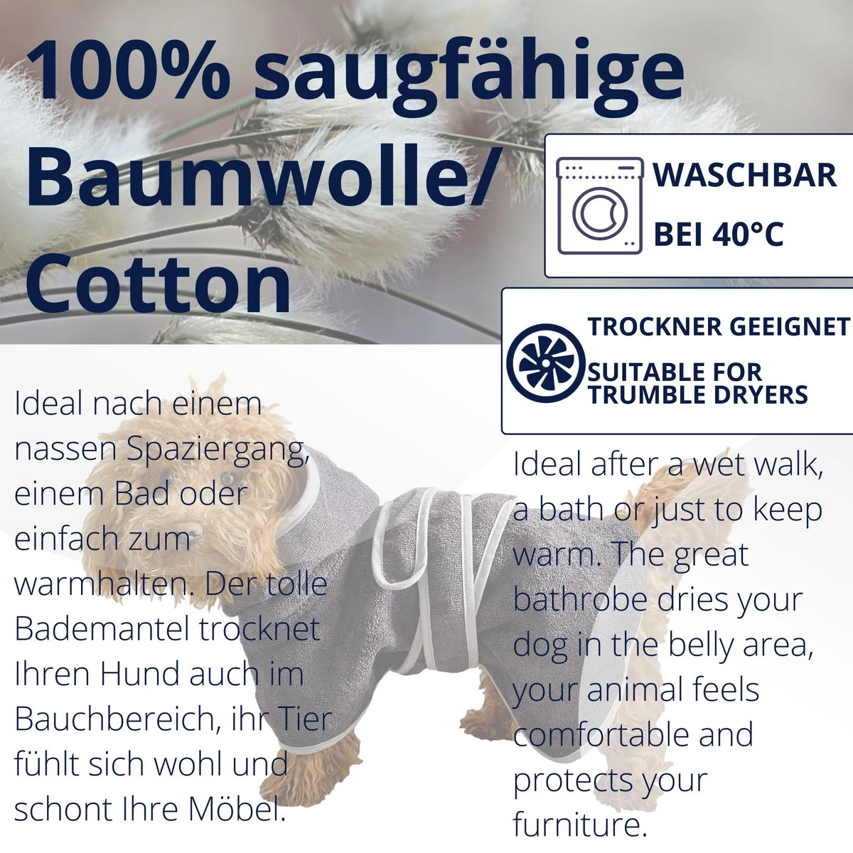 DETAILS: De absorberende hondenjas is gemaakt van 100% katoen. Dit materiaal is uitermate zacht en absorbeert het water en vocht snel. De badjas is beschikbaar in verschillende maten voor zowel grote als kleine honden.
