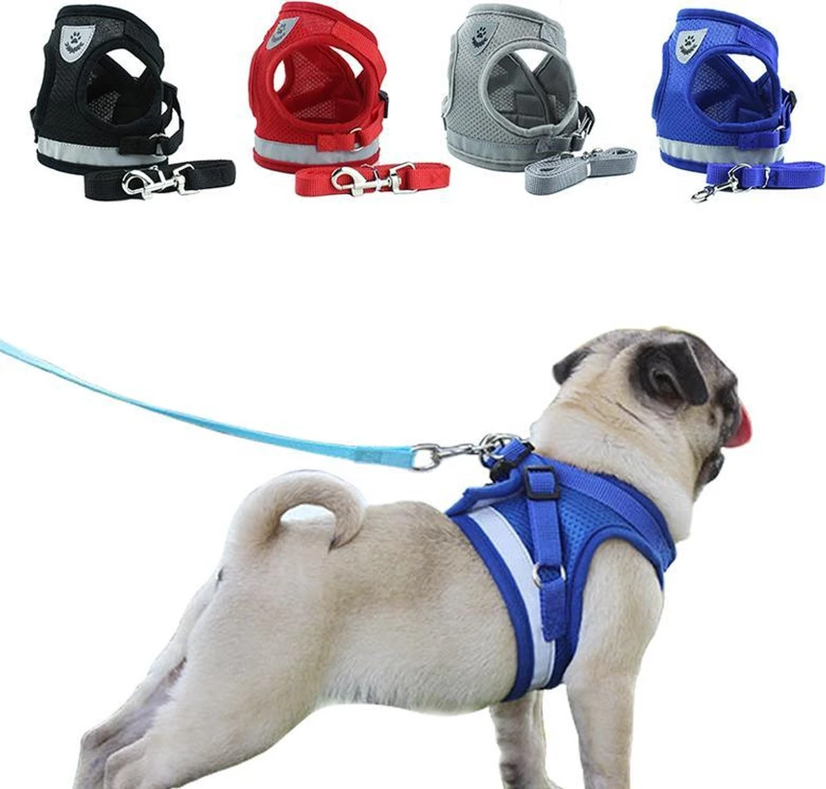 Er zit een hondenriem bij inbegrepen van +/- 100-110 cm. Het is gemakkelijk om een eigen hondenriem (zie clickbevestiging foto’s) op dit harnas te bevestigen.